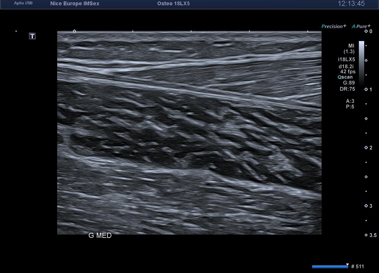 L’exploration statique haute résolution de la cheville et du mollet s'avère strictement normale. Les tendons calcanéens (d'Achille) présentent une écho-structure fibrillaire parfaitement conservée, sans épaississement focal, ni hyperhémie au Doppler énergie. L'exploration de la loge postérieure montre des ventres musculaires gastrocnémiens et soléaires volumineux mais d'échostructure normale, tout comme les jonctions myo-aponévrotiques. L'artère poplitée est perméable au repos, avec un flux Doppler triphasique physiologique.