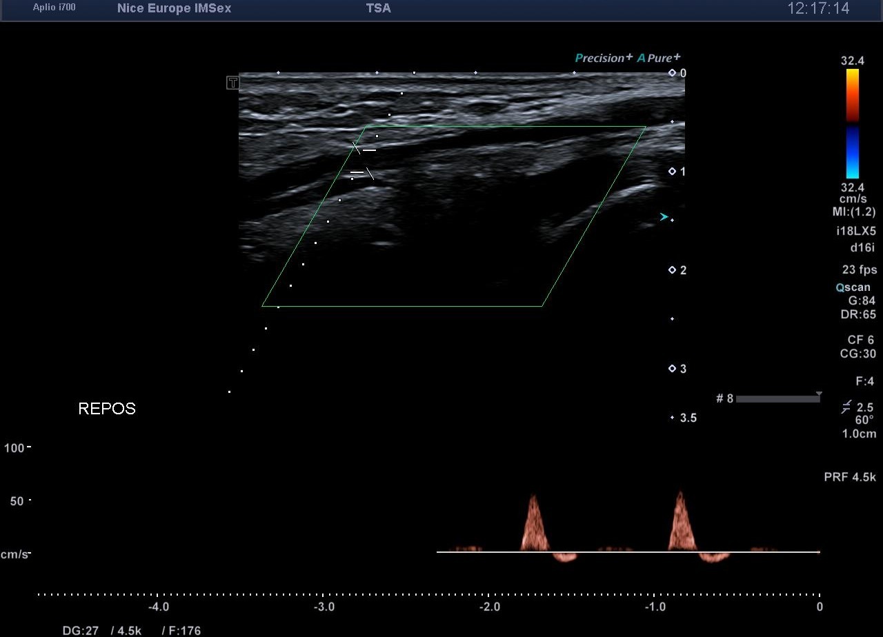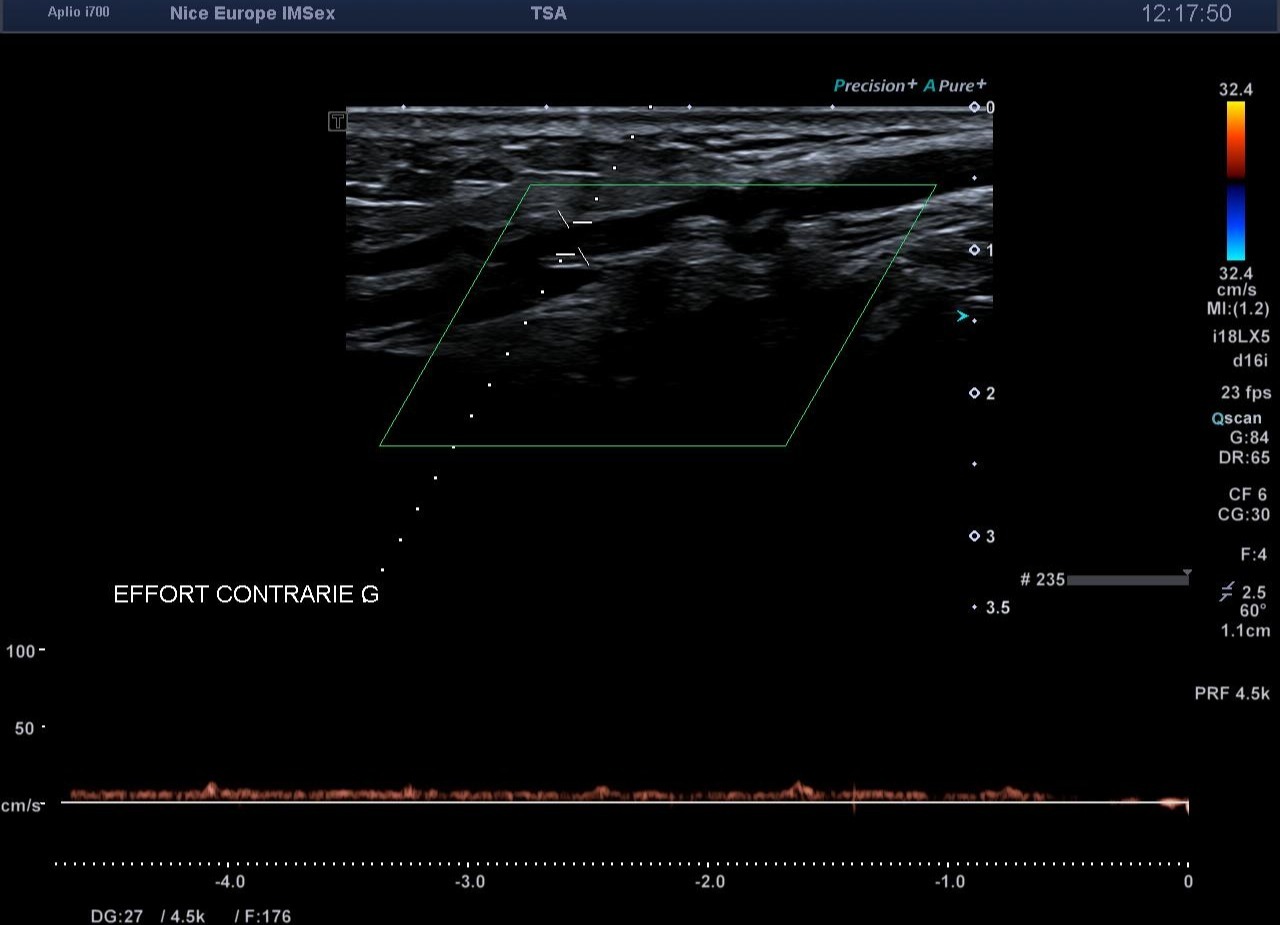 À ce stade, l'examen clinique, obligatoirement réalisé de manière concomitante à l'exploration échographique, prend tout son sens. La palpation minutieuse des loges musculaires et la parfaite intégrité des tendons obligent l'opérateur à s'écarter de la prescription initiale pour rechercher une étiologie vasculaire à cette symptomatologie d'effort.