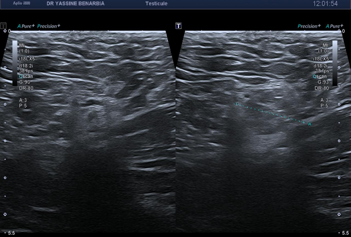 La douleur testiculaire est un motif fréquent de consultation en échographie. Dans une proportion significative de cas, l'examen testiculaire est strictement normal et la cause se situe en dehors du scrotum, notamment au niveau de la région inguinale.